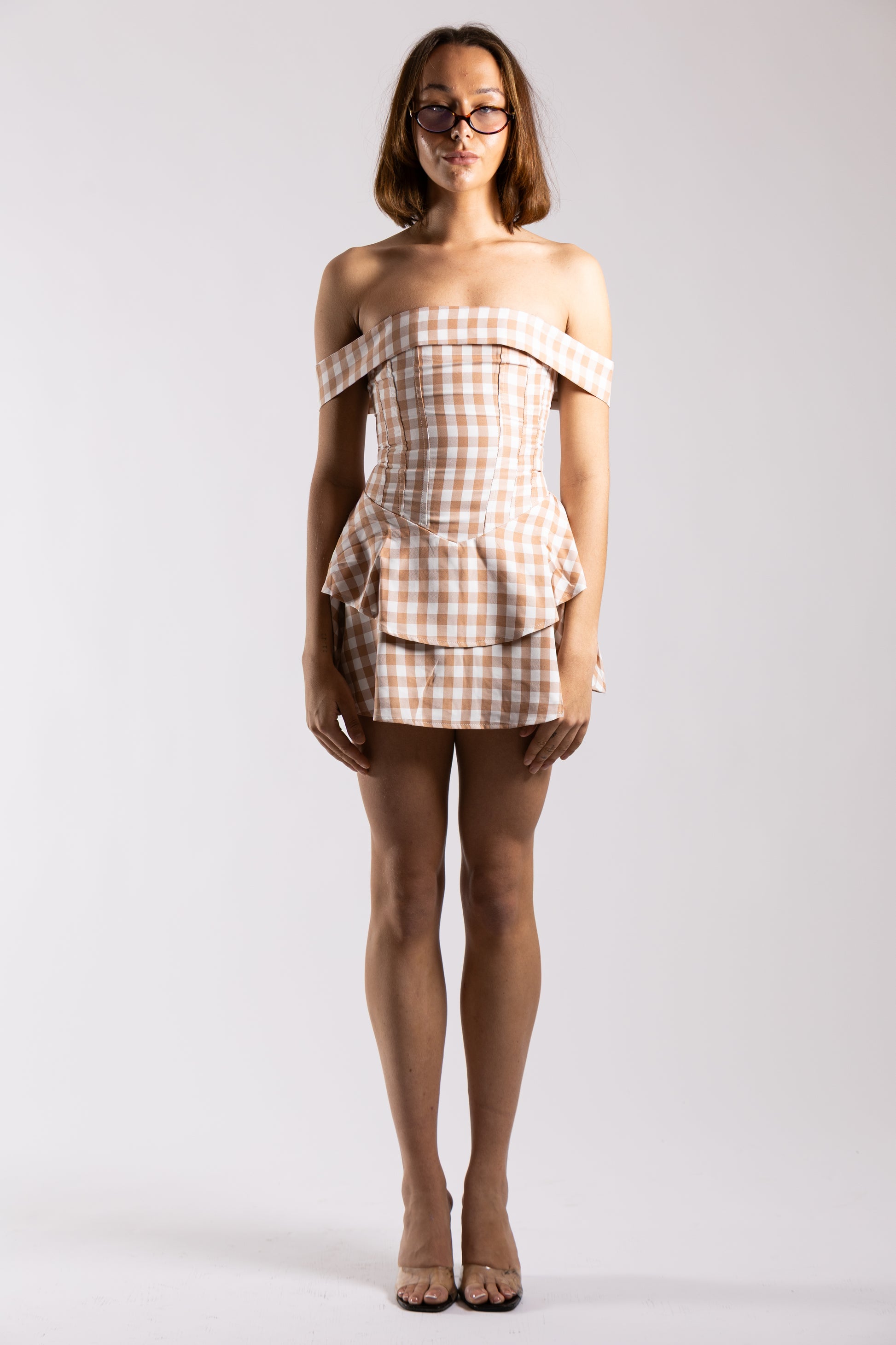 The soft gingham fabric and off-the-shoulder band add a touch of vintage charm, making it ideal for brunch dates, parties, or sunset drinks. It’s a wardrobe essential that feels as good as it looks — timelessly elegant yet effortlessly wearable.